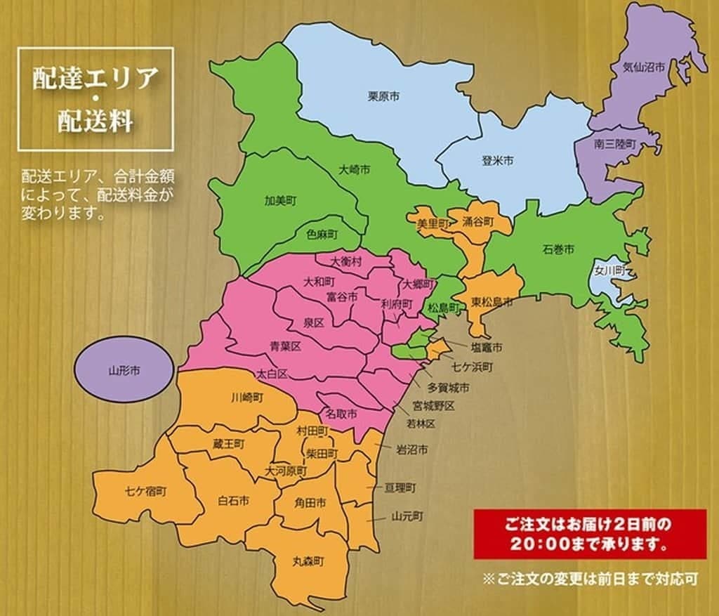 配達エリアとご注文金額によって配送料金が異なります。詳しく配達エリアと配送料をご確認をご確認ください。